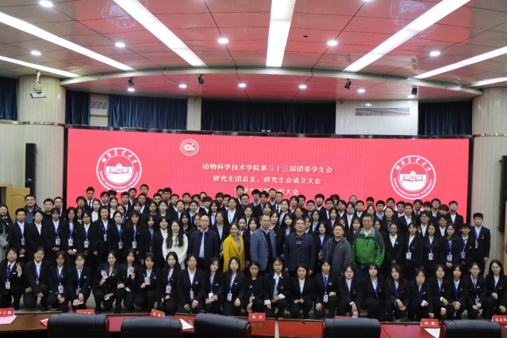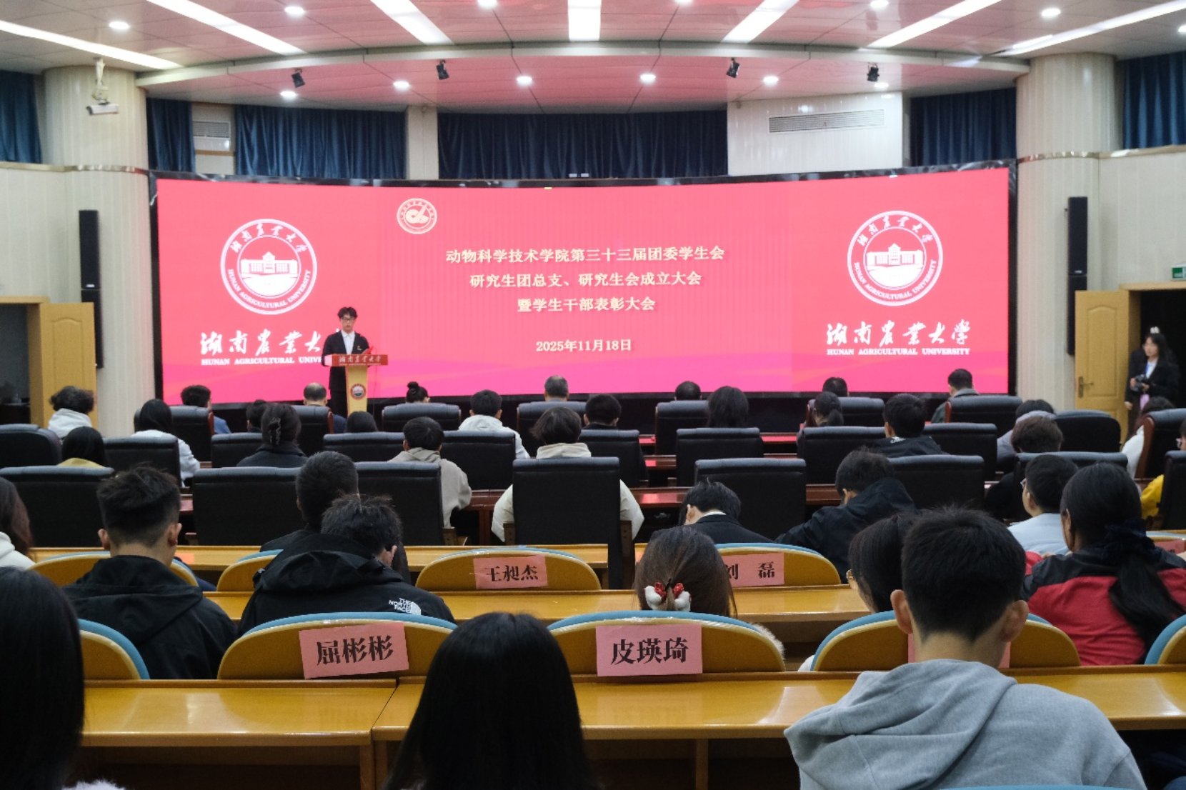 11月18日晚,湖南农业大学动物科学技术学院第三十三届团委学生会、研究生团总支、研究生会成立大会暨学生干部表彰大会在生科楼国际会议厅隆重举行。学院院长贺喜、党委书记祖智波、专职组织员徐琳、副院长何俊、党委副书记周军铁、副院长范志勇、全体辅导员,校院各学生组织代表、学院第三十三届团委学生会、研究生团总支、研究生会全体成员齐聚一堂,共同见证这一重要时刻。大会由第三十三届团委学生会副书记吴俊豪主持。