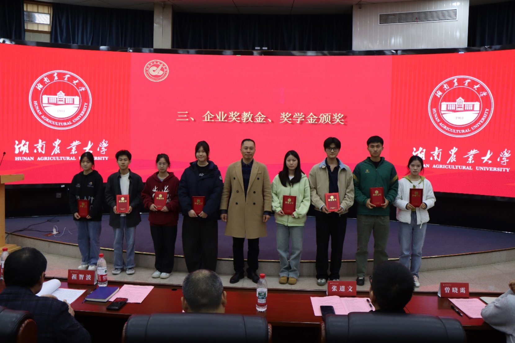 企业奖学金获奖学生代表进行发言。他们分享了在学习、科研与社会实践中的积极探索,并纷纷表示将以企业创新、责任、价值、共享的精神为指引,努力成为兼具专业能力与家国情怀的农科学子,未来回馈行业、传递爱心。