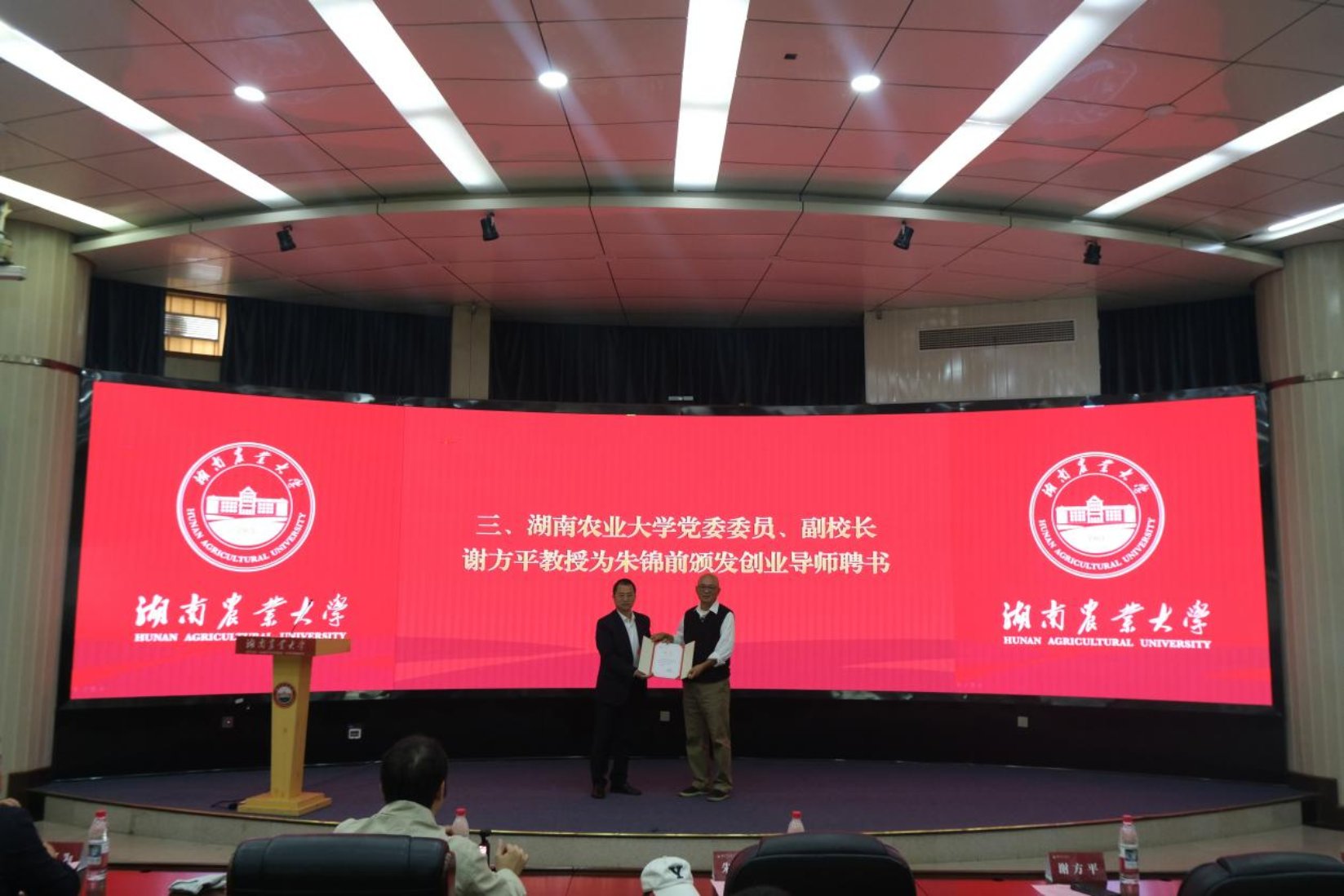 张胜利宣读《关于聘任朱锦前为大学生创业导师的通知》,谢方平为朱锦前颁发大学生创业导师聘书。