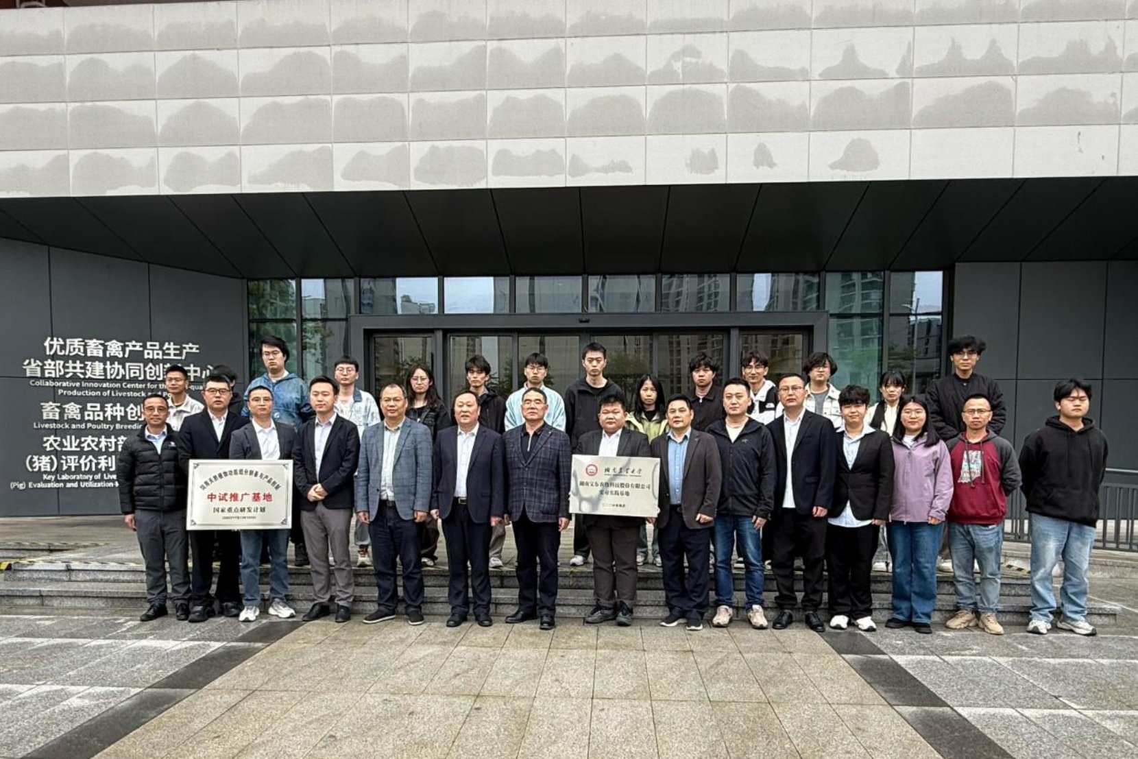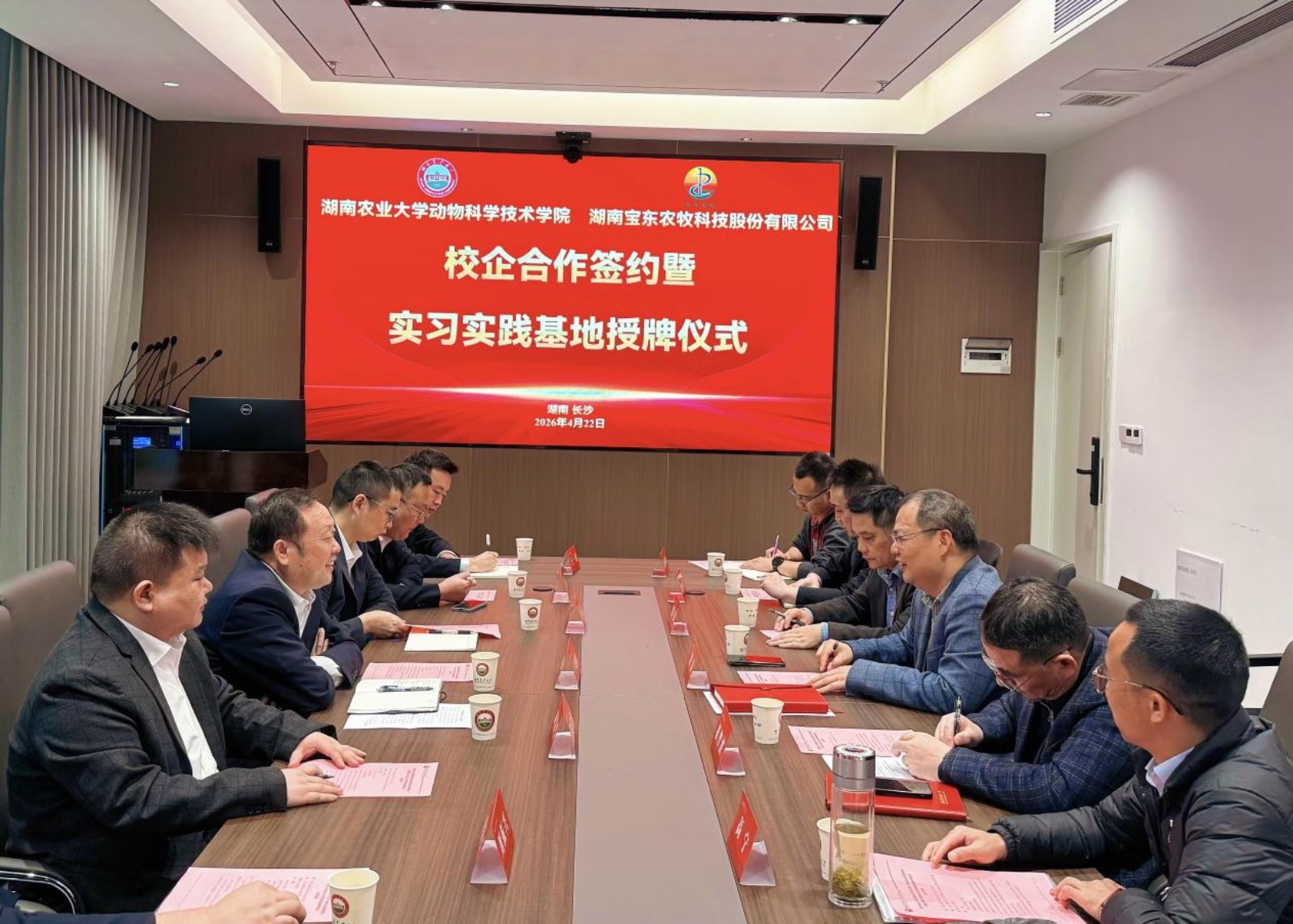 4月22日,动物科学技术学院与湖南宝东农牧科技股份有限公司(以下简称“宝东农牧”)校企合作签约暨基地授牌仪式在岳麓山实验室举行。仪式由学院党委书记祖智波主持。学院院长贺喜、宝东农牧董事长王晚秋等双方领导及代表出席仪式。