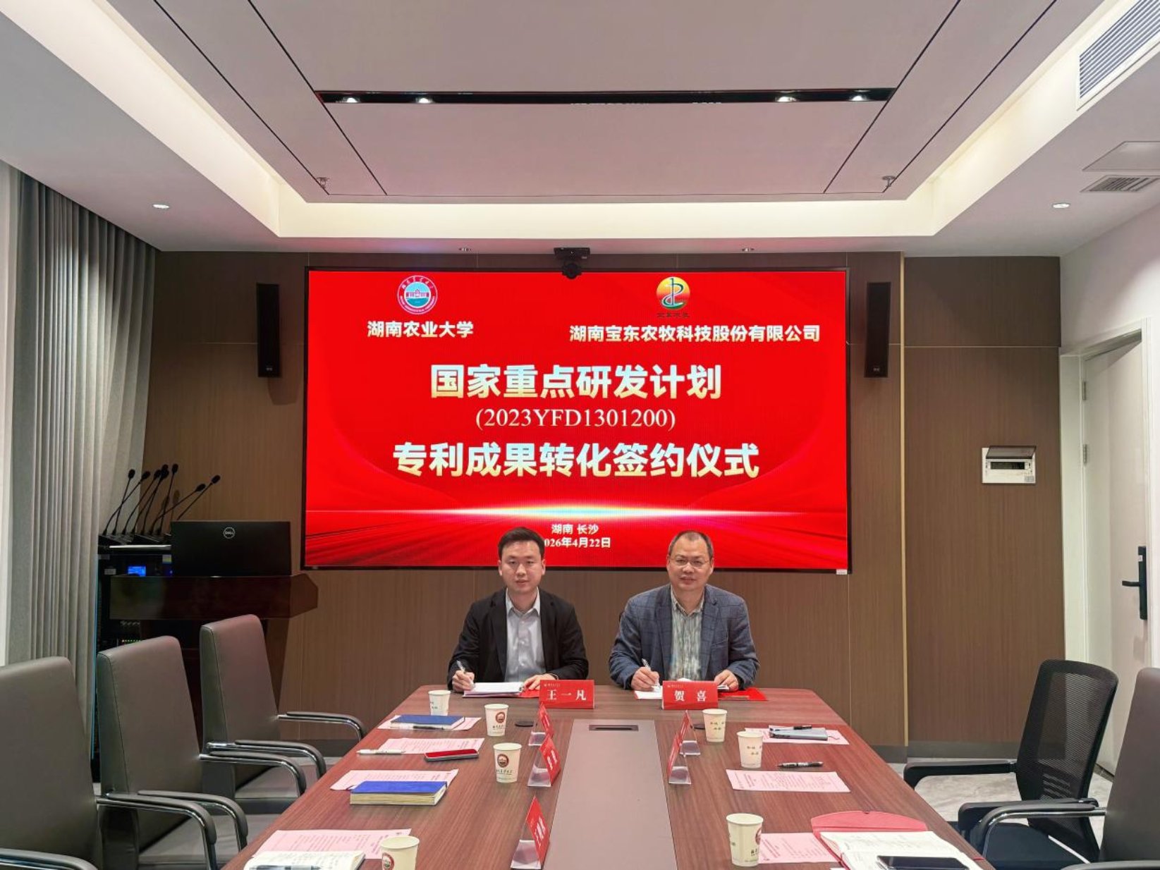 在与会人员的共同见证下,贺喜与宝东农牧执行董事王一凡代表双方签署了校企合作协议,并为“湖南农大动科学院-宝东农牧实习实践基地”授牌。仪式上还举行了“十四五”国家重点研发计划“饲用天然植物功能组分制备与产品创制”成果中试推广基地授牌仪式,标志着该国家级项目成果将依托宝东农牧平台开展中试转化与产业化推广。同时,双方就项目专利成果“一种植物甾醇和植物甾醇酯复合剂及其应用”签署了技术转化协议,推动高价值专利落地应用。