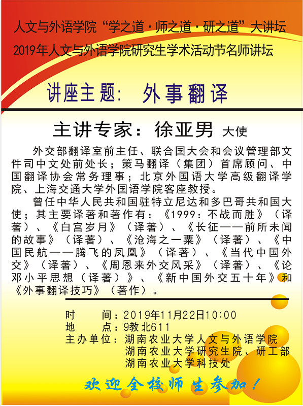 2019年人文与外语学院研究生学术活动节名师讲坛——外事翻译
